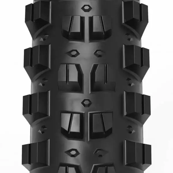 Il est composé de crampons hauts assurant une grande traction et un bon support sur les terrains secs et humides, racineux ou rocailleux. Il est conçu avec la gomme TriTec qui rassemble trois couches de caoutchouc différentes afin d’offrir un parfait compromit entre la traction, la souplesse et la durabilité du pneu. Les crampons centraux sont plus durs afin d’offrir une meillleur traction durant le pédalage tandis que les crampons latéraux sont plus soupleq pour donner un meilleur grip dans les virages.